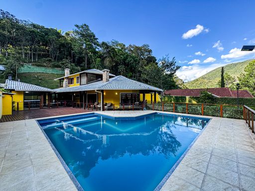 Casa de alto padrão sendo vendida em formato de porteira fechada, fora de condomínio em localização nobre em um bairro bucólico e tranquilo na cidade de Teresópolis, região serrana do Rio de Janeiro. Imóvel projetado nos mínimos detalhes, ideal para o cliente que busca uma arquitetura moderna, com uma mistura contemporânea de madeira com vidro, trazendo iluminação e um ambiente aconchegante. Casa com uma excelente disposição tendo a principal parte do terreno de forma plana, com grande facilidade de acesso e locomoção pelo imóvel. No seu pavimento de entrada já encontramos um belo visual com pé direito duplo, espaços integrados de sala de estar, cozinha e sala de jantar. A sala de estar conta com uma lareira, a cozinha integrada com ilha no meio e um aconchegante espaço de leitura alinhado em uma parede de tijolo. Ainda no pavimento de entrada temos 2 quartos sendo 1 suíte, banheiro social, lavabo e lavanderia. No pavimento superior temos 3 quartos sendo 1 suíte master com banheira e closet, 1 suíte comum e 1 quarto de hospedes externo, ideal para ganhar mais privacidade. Na parte externa da casa vemos o espaço sofisticado espaço gourmet, com acabamentos de qualidade e um espaço agradável junto a natureza. Bom espaço de terreno e canil para os animais circularem tranquilamente. Está esperando o que para comprar essa obra prima?!