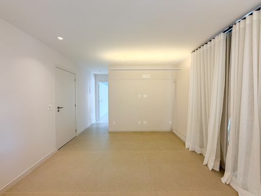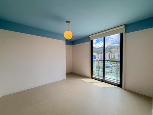 A sala é bem iluminada e se conecta à varanda, proporcionando um ambiente perfeito para relaxar ou receber visitas. As cortinas com blackout garantem mais conforto e privacidade no dia a dia.