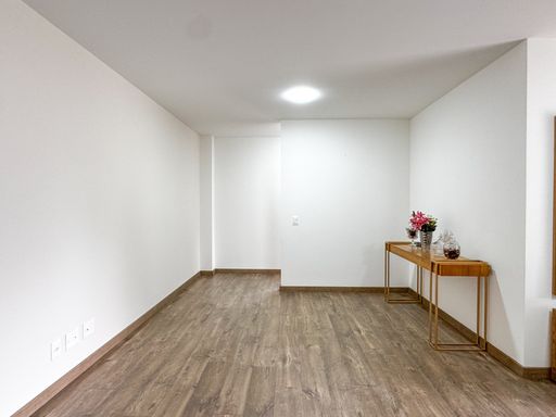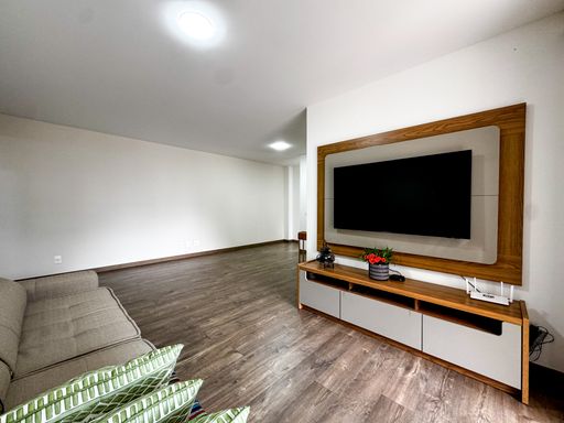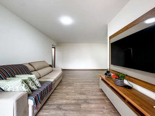 O apartamento dispõe de sala dividida em 2 ambientes, varanda gourmet com churrasqueira, 2 suítes, lavabo, cozinha equipada com armários planejados, área de serviço e banheiro de serviço.
