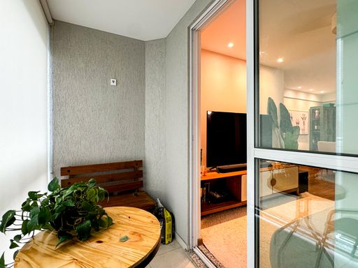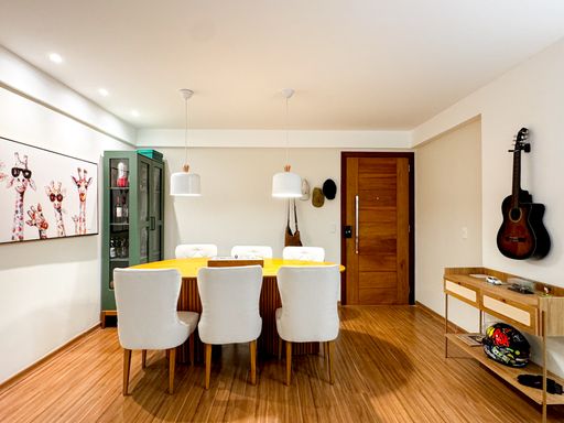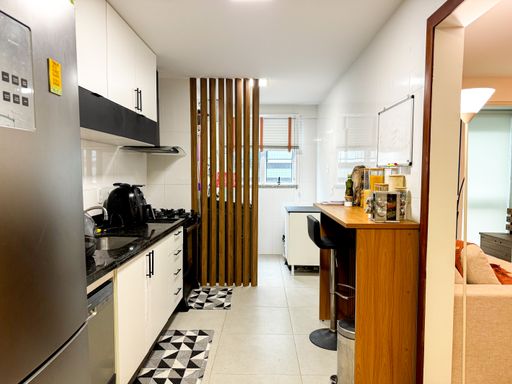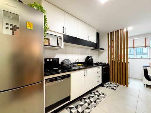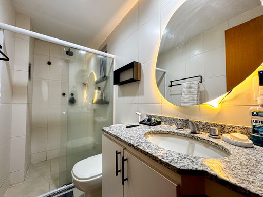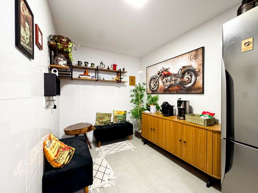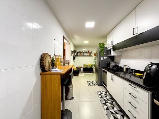 O imóvel conta com 2 quartos, sendo 1 suíte, sala aconchegante com varanda, ideal para momentos de descanso, além de cozinha e banheiros com armários planejados, oferecendo funcionalidade e organização no dia a dia.
