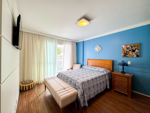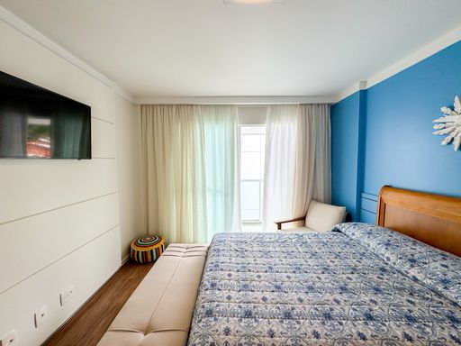 A sala é espaçosa, dividida em dois ambientes, ideal para receber convidados, e conta com acesso a uma varanda ampla com churrasqueira, perfeita para momentos de lazer. A suíte também possui varanda privativa, trazendo ainda mais charme e ventilação ao imóvel.