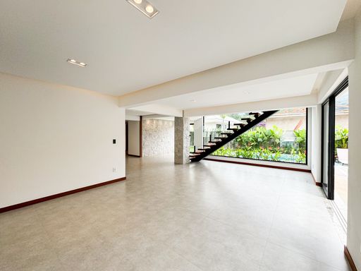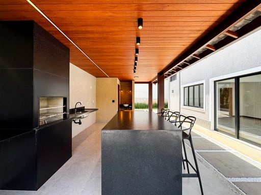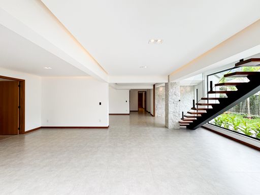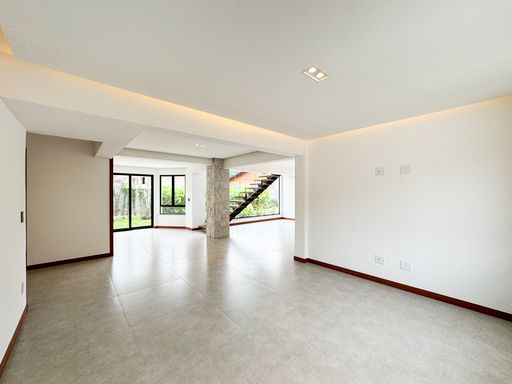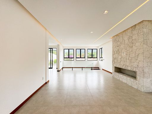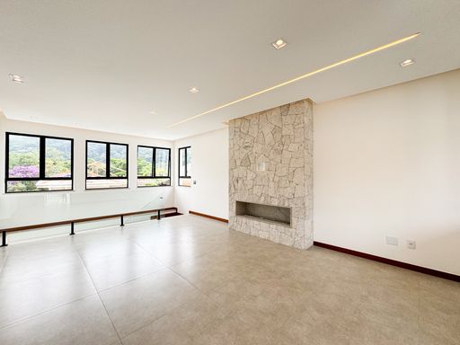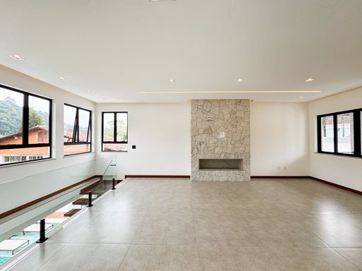 O imóvel possui 2 salas (inferior e superior), sendo a principal ampla e dividida em dois ambientes com lareira. São 4 quartos (3 suítes), além de banheiro social e lavabo. A cozinha em conceito aberto proporciona mais integração e funcionalidade.