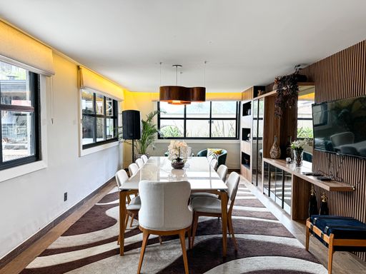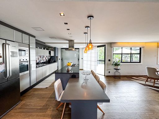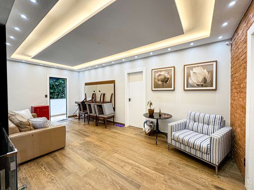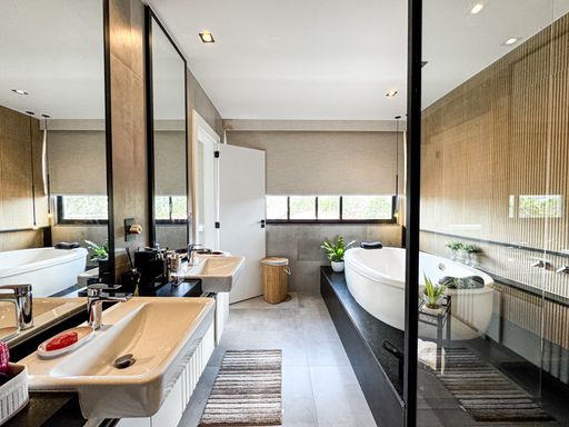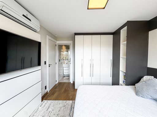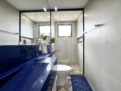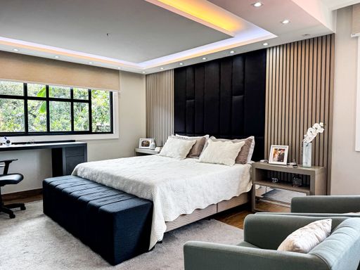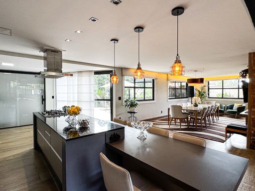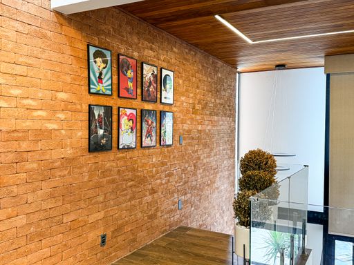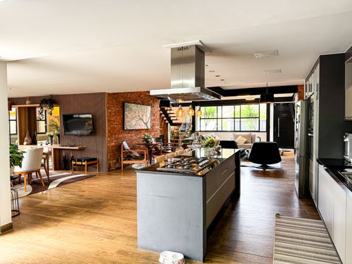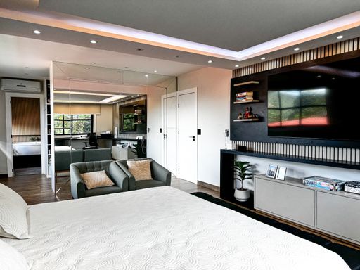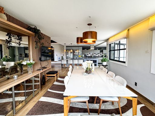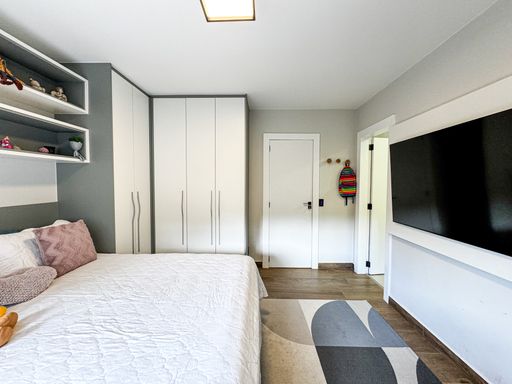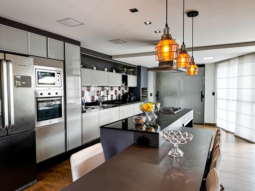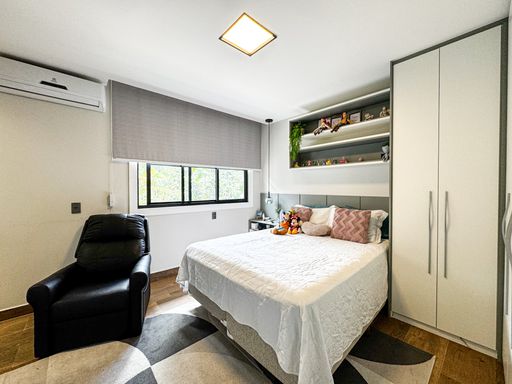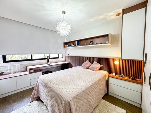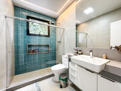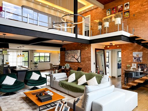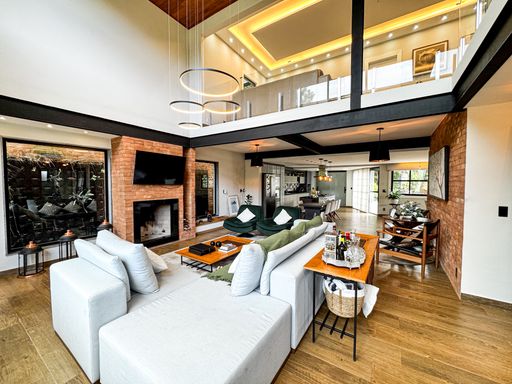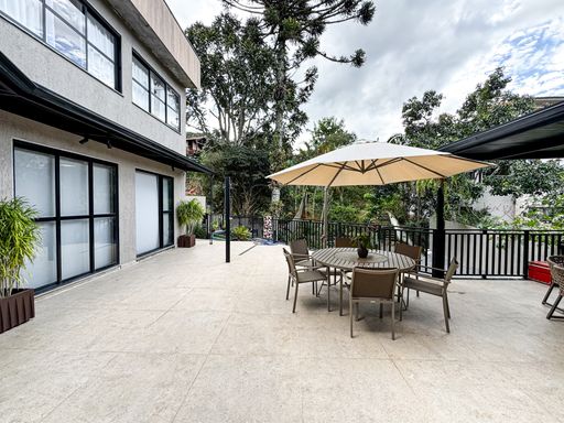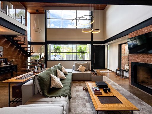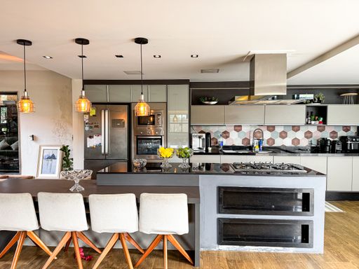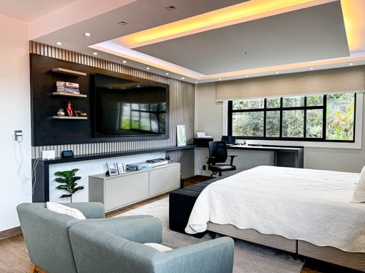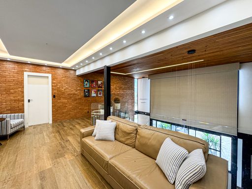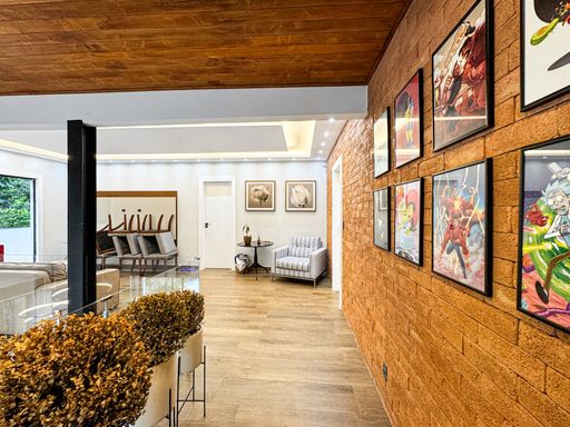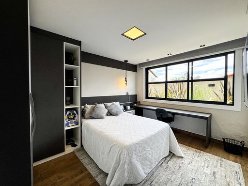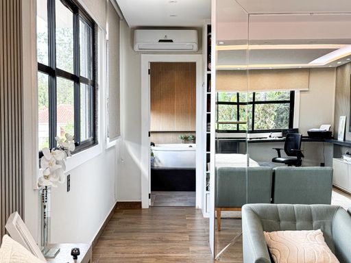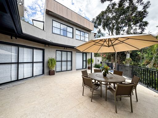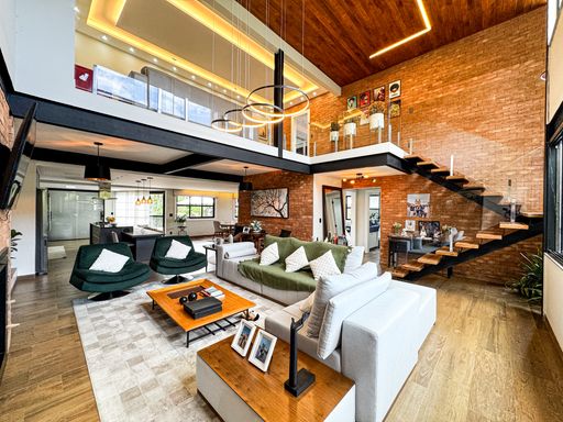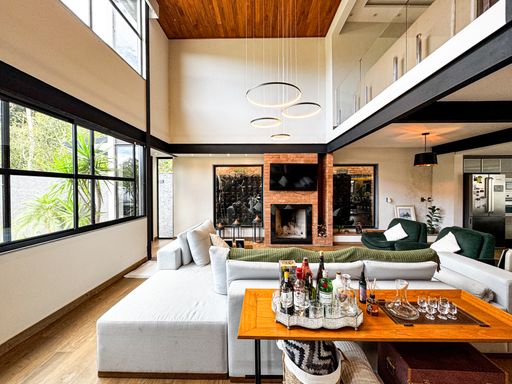 No seu pavimento de entrada já encontramos um belo visual com pé direito duplo, espaços integrados de sala de estar, cozinha e sala de jantar. A sala de estar conta com uma lareira, a cozinha integrada com ilha no meio e um aconchegante espaço de leitura alinhado em uma parede de tijolo. Ainda no pavimento de entrada temos 2 quartos sendo 1 suíte, banheiro social, lavabo e lavanderia. No pavimento superior temos 3 quartos sendo 1 suíte master com banheira e closet, 1 suíte comum e 1 quarto de hospedes externo, ideal para ganhar mais privacidade.