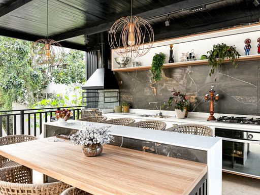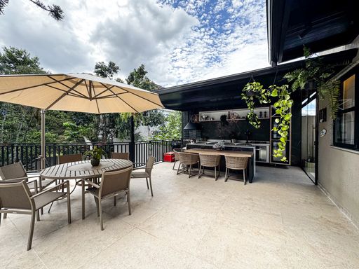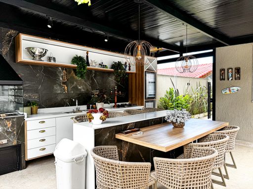 Na parte externa da casa vemos o espaço sofisticado espaço gourmet, com acabamentos de qualidade e um espaço agradável junto a natureza. Bom espaço de terreno e canil para os animais circularem tranquilamente.