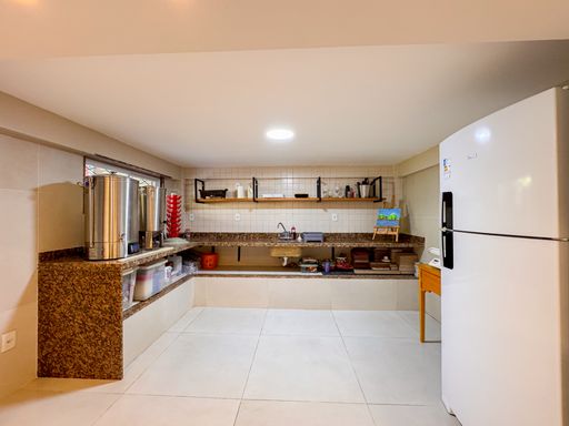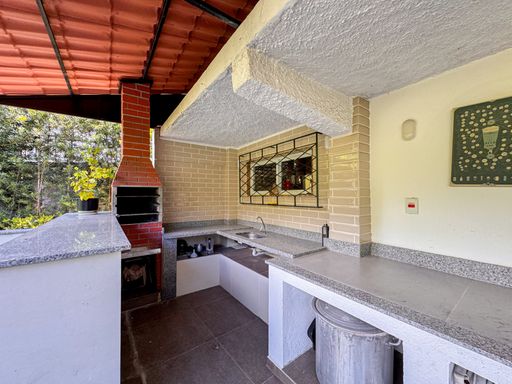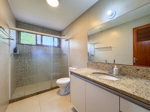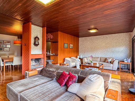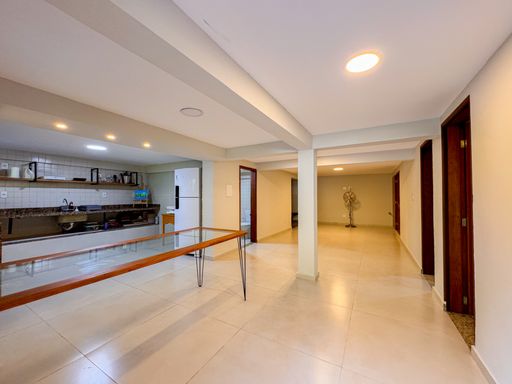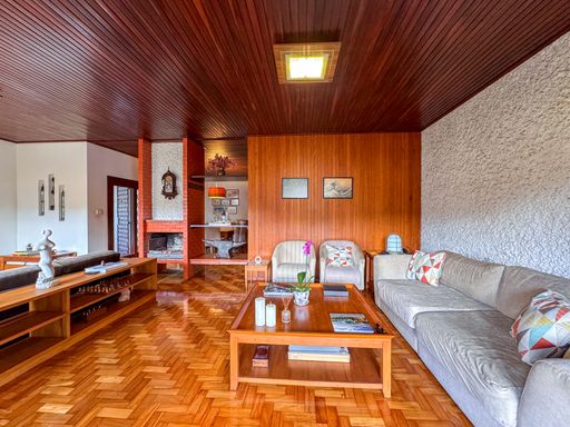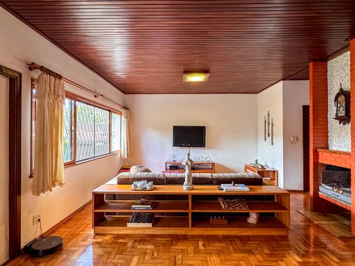 A casa principal impressiona pela amplitude e funcionalidade. A sala é distribuída em três ambientes: estar, TV e jantar, harmoniosamente integrados e divididos por uma aconchegante lareira, criando um espaço acolhedor e sofisticado. A cozinha, equipada com móveis planejados, é prática e bem iluminada, recebendo luz natural através de suas janelas.