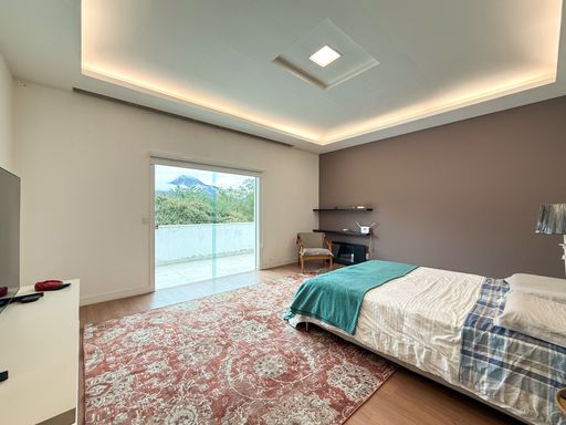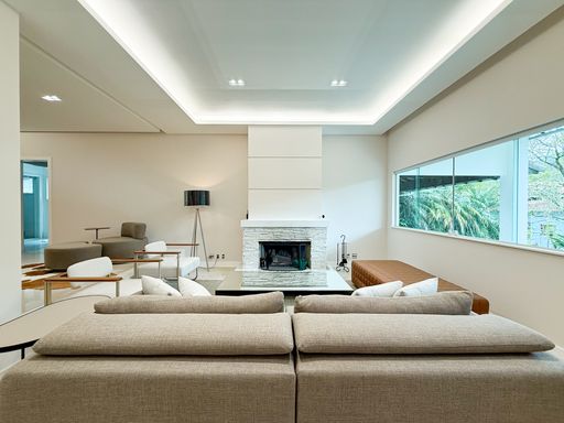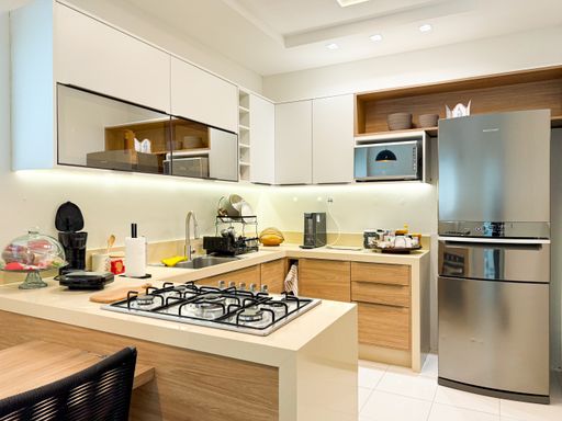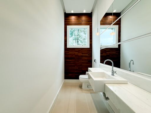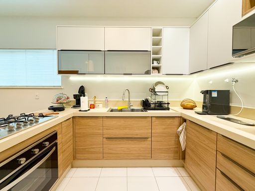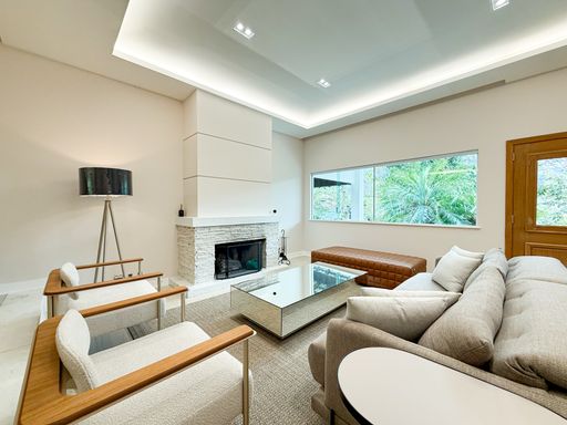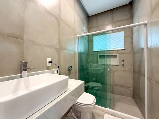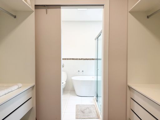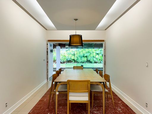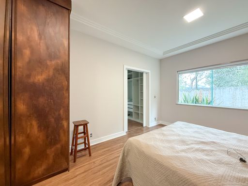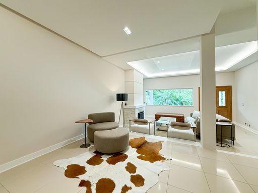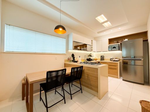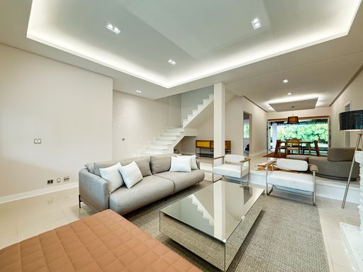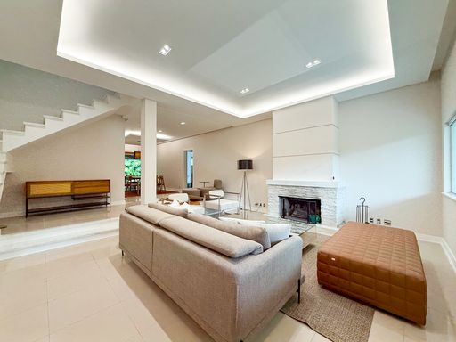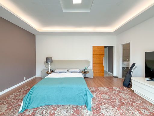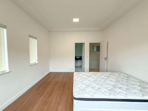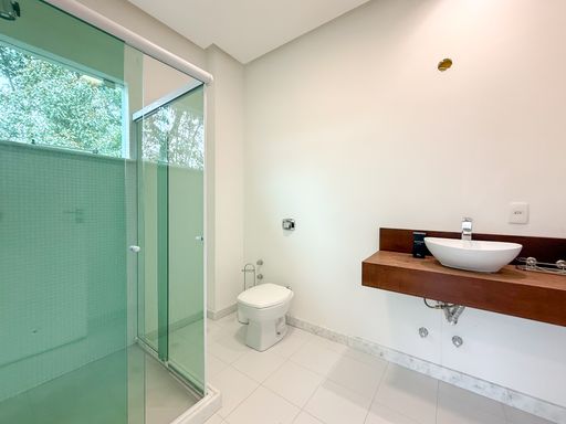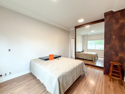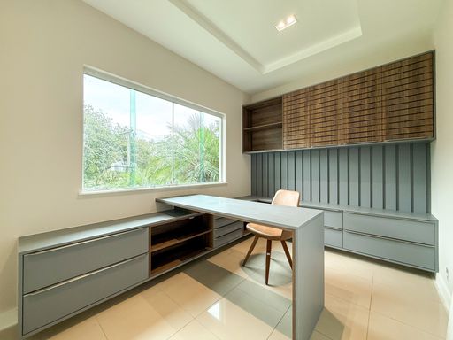 No segundo andar, encontram-se uma suíte master com varanda privativa, mais uma suíte e um salão amplo que pode ser adaptado como sala íntima, home theater ou espaço de convivência, além de rouparia ou closet adicional.