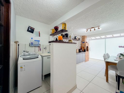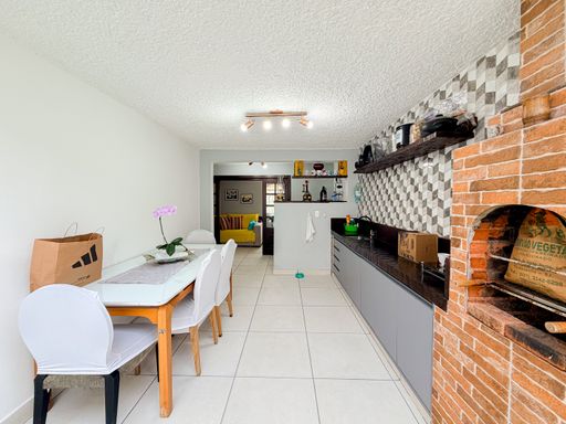 Para receber amigos e familiares, a casa oferece uma área gourmet com churrasqueira e banheiro de apoio, perfeita para momentos especiais.