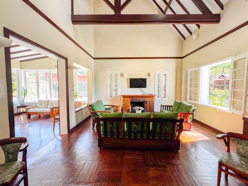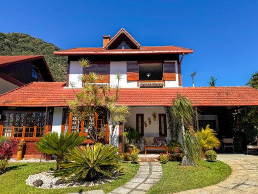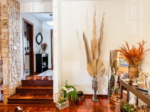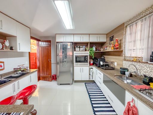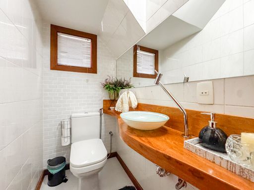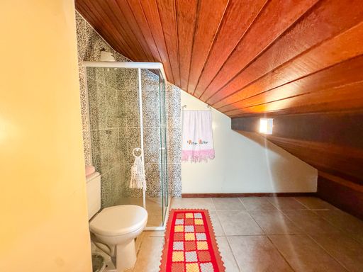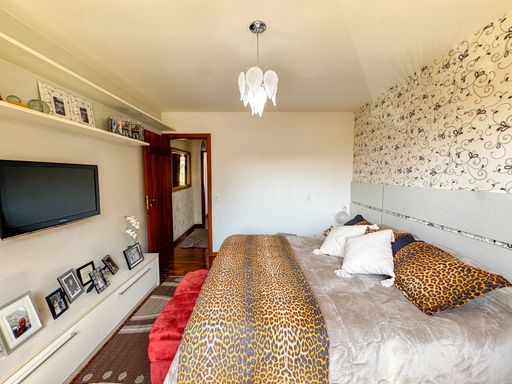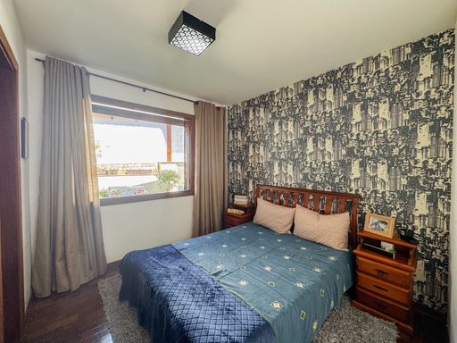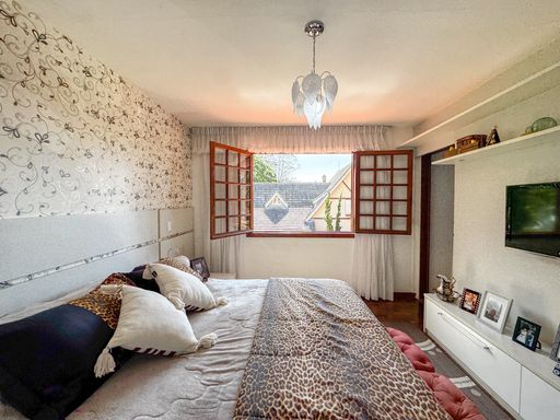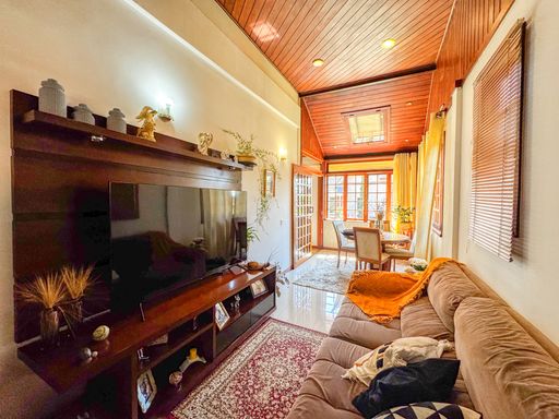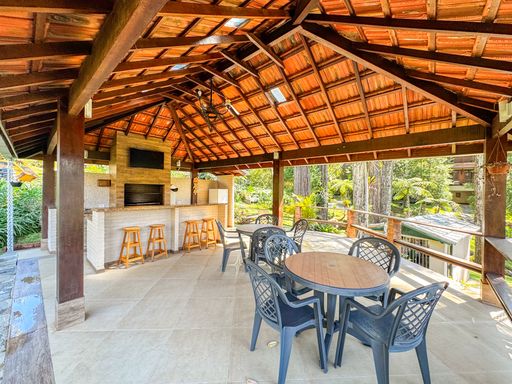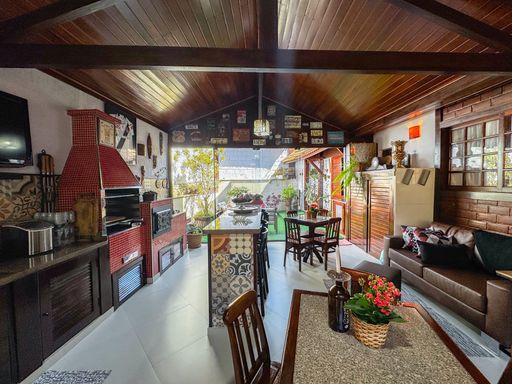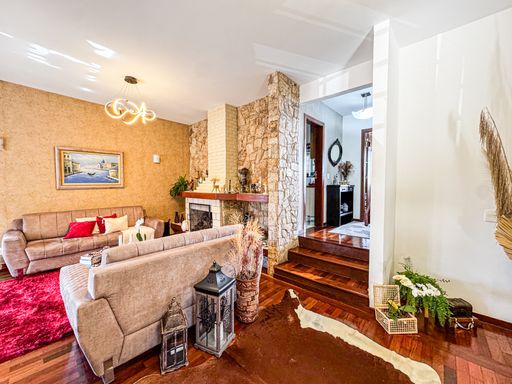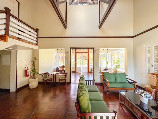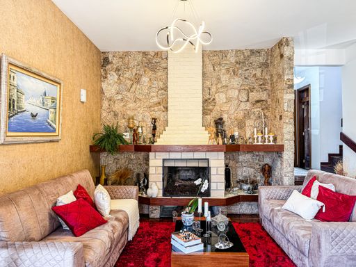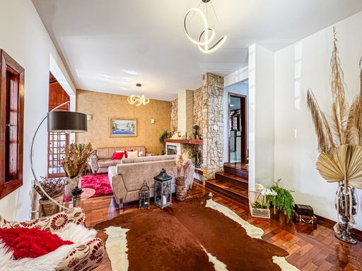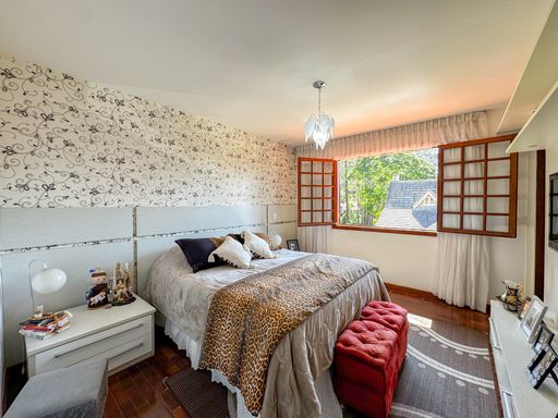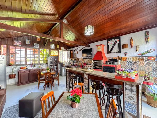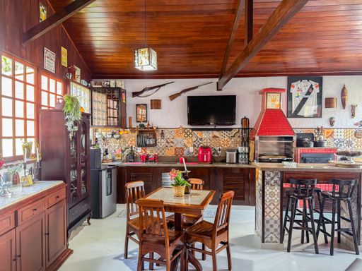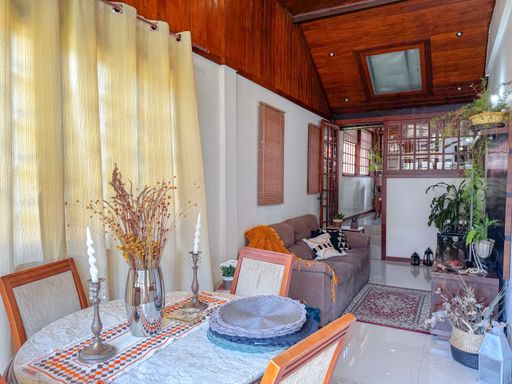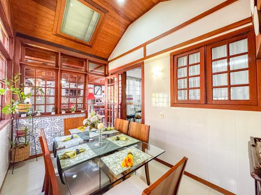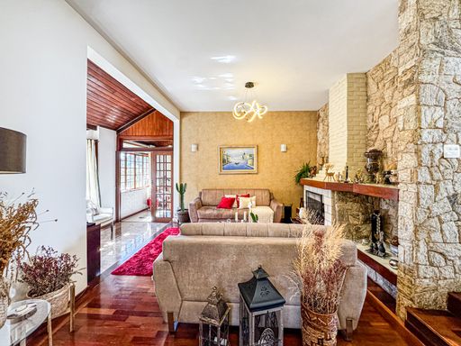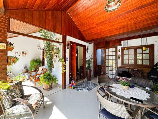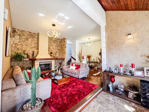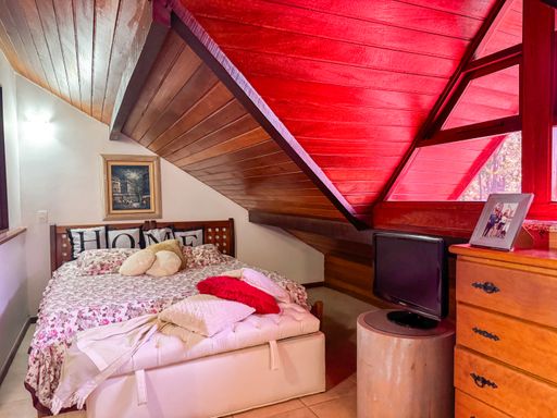 A casa é uma das maiores do condomínio e impressiona pelo excelente estado de conservação e amplitude dos espaços. Com madeiras muito bem cuidadas e um jardim encantador na frente, o imóvel foi pensado para receber com elegância e aconchego. São duas salas — uma de TV e outra de lazer com lareira — além de uma sala de jantar espaçosa e uma cozinha planejada com porcelanato, que une funcionalidade e bom gosto. Conta ainda com lavabo, lavanderia, sótão versátil e 4 suítes completas, sendo uma delas com closet.