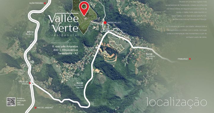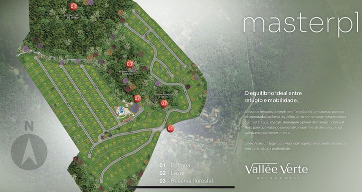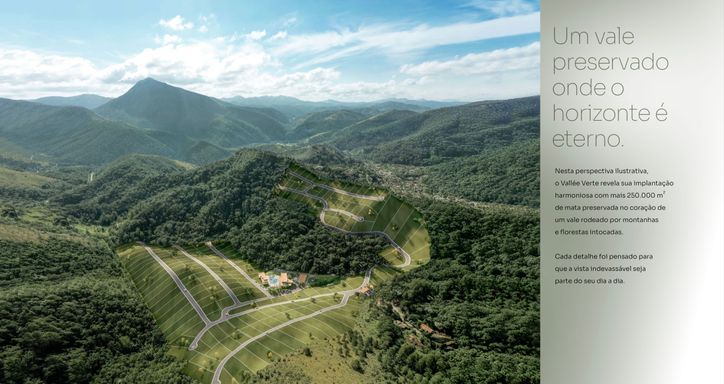 Implantado em uma área privilegiada, o Vallée Verte conta com mais de 256.000 m² de área verde preservada, oferecendo um clima diferenciado, contato direto com a natureza e uma sensação única de bem-estar. São 224 lotes residenciais, com metragens que variam de 538 m² a 2.775 m², frente média de 20 metros e topografia que favorece projetos arquitetônicos imponentes, bem ventilados e iluminados, seja para casas térreas ou de dois pavimentos. Os lotes em aclive e declive proporcionam vistas livres e a possibilidade de criação de belos platôs.